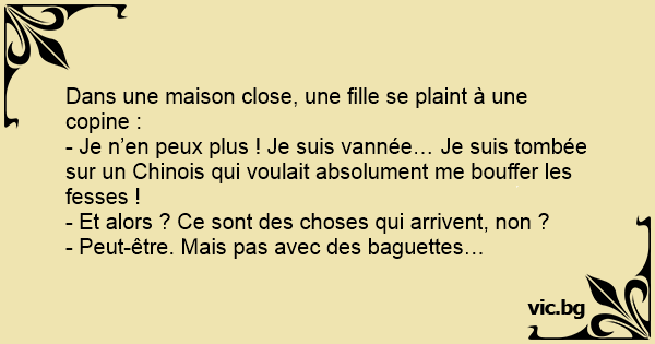 - Je n’en peux plus ! Je suis vannée… Je suis tombée sur un Chinois qui voulait absolument me bouffer les fesses !