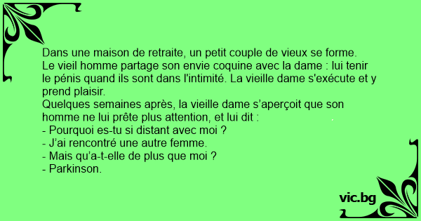 C'est un couple de petits vieux qui se forme dans une maison de retraite. C'est Robert et Jacqueline. Un jour, Robert dit à Jacqueline : - Écoutes Jacqueline, j'ai un fantasme : c'est que tu me...
