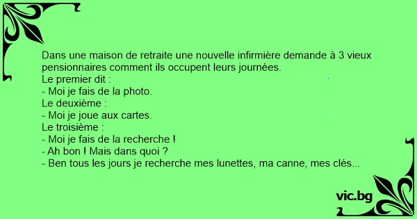 Dans une maison de retraite une nouvelle infirmière demande à 3 vieux pensionnaires comment ils occupent leurs journées.