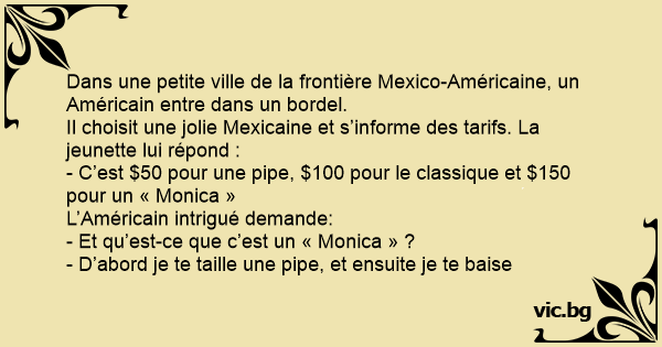 Il choisit une jolie Mexicaine et s’informe des tarifs. La jeunette lui répond :