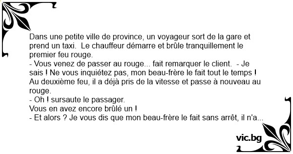 - Vous venez de passer au rouge... fait remarquer le client. - Je sais ! Ne vous inquiétez pas, mon beau-frère le fait tout le temps !