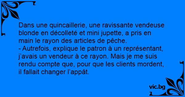 - Autrefois, explique le patron à un représentant, j’avais un vendeur à ce rayon. Mais je me suis rendu compte que, pour que les clients mordent, il fallait changer l’appât.