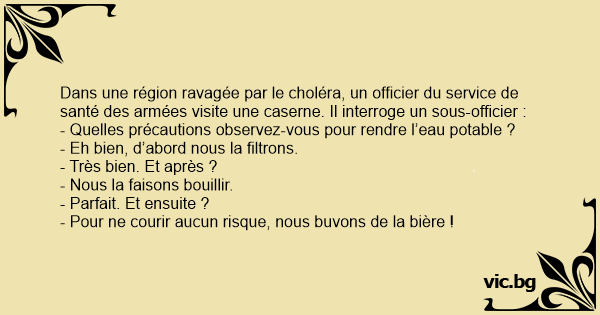 Dans une région ravagée par le choléra, un officier du service de santé des armées visite une caserne. Il interroge un sous-officier :