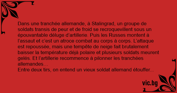 Dans une tranchée allemande, à Stalingrad, un groupe de soldats transis de peur et de froid se recroquevillent sous un épouvantable déluge d’artillerie. Puis les Russes montent à l’assaut et c’est un atroce combat au corps à corps. L’attaque est repoussée, mais une tempête de neige fait brutalement baisser la température déjà polaire et plusieurs soldats meurent gelés. Et l’artillerie recommence à pilonner les tranchées allemandes…
