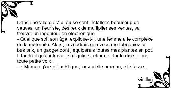 - Quel que soit son âge, explique-t-il, une femme a le complexe de la maternité. Alors, je voudrais que vous me fabriquiez, à bas prix, un gadget dont j’équiperais toutes mes plantes en рот. Il faudrait qu’à intervalles réguliers, chaque plante dise, d’une toute petite voix :