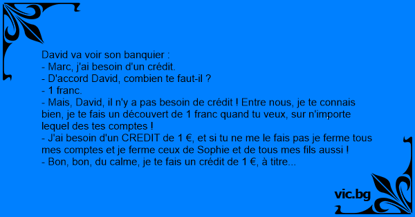 - Mais, David, il n'y a pas besoin de crédit ! Entre nous, je te connais bien, je te fais un découvert de 1 franc quand tu veux, sur n'importe lequel des tes comptes !
