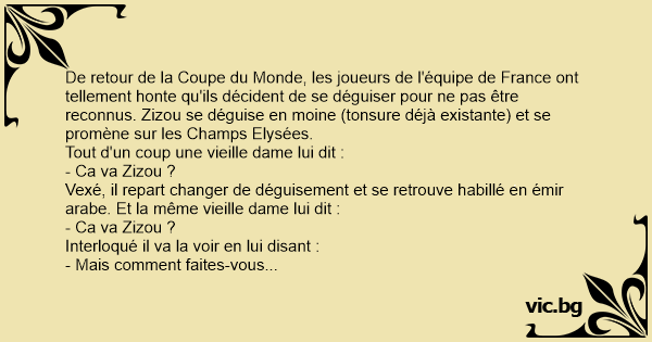 De retour de la Coupe du Monde, les joueurs de l'équipe de France ont tellement honte qu'ils décident de se déguiser pour ne pas être reconnus. Zizou se déguise en moine (tonsure déjà existante) et se promène sur les Champs Elysées.