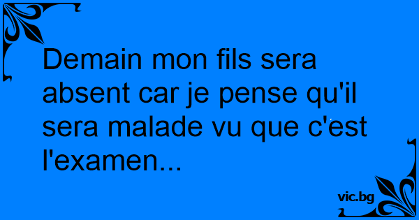 Demain mon fils sera absent car je pense qu'il sera malade vu que c'est l'examen...