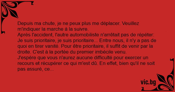 Monsieur, j'ai l'honneur de vous déclarer que je viens de faire mon cinquième accident de l'année. Vous pouvez dire que je suis dans la poisse. Mais vous noterez que pour mon troisième, j'étais pas dans mon tort.