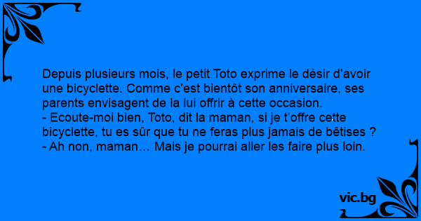 - Ecoute-moi bien, Toto, dit la maman, si je t’offre cette bicyclette, tu es sûr que tu ne feras plus jamais de bêtises ?