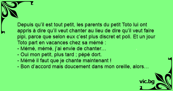 Depuis qu’il est tout petit, les parents du petit Toto lui ont appris à dire qu’il veut chanter au lieu de dire qu’il veut faire pipi, parce que selon eux c’est plus discret et poli. Et un jour Toto part en vacances chez sa mémé :