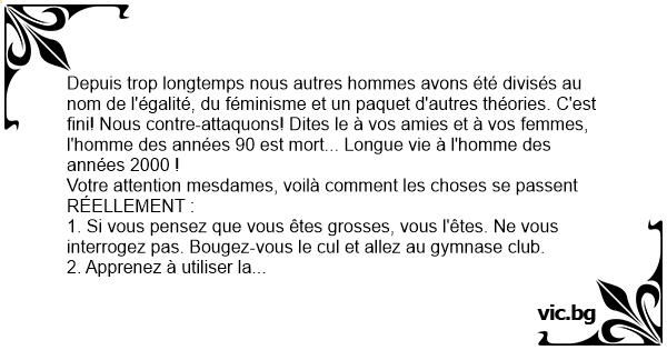 Depuis trop longtemps nous autres hommes avons été divisés au nom de l'égalité, du féminisme et un paquet d'autres théories. C'est fini! Nous contre-attaquons! Dites le à vos amies et à vos femmes, l'homme des années 90 est mort... Longue vie à l'homme des années 2000 !