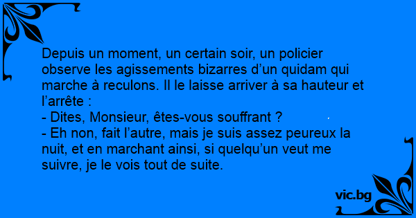 Depuis un moment, un certain soir, un policier observe les agissements bizarres d’un quidam qui marche à reculons. Il le laisse arriver à sa hauteur et l’arrête :
