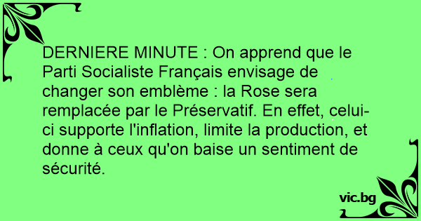 DERNIERE MINUTE : On apprend que le Parti Socialiste Français envisage de changer son emblème : la Rose sera remplacée par le Préservatif. En effet, celui-ci supporte l'inflation, limite la production, et donne à ceux qu'on baise un sentiment de sécurité.