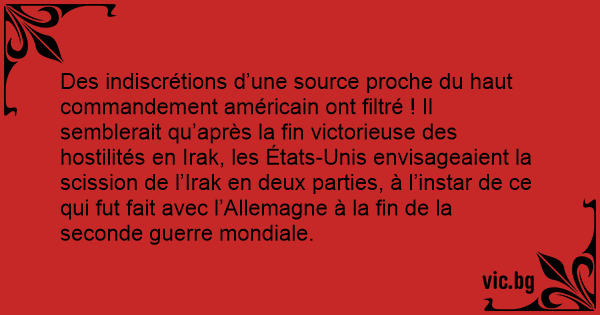 Des indiscrétions d’une source proche du haut commandement américain ont filtré ! Il semblerait qu’après la fin victorieuse des hostilités en Irak, les États-Unis envisageaient la scission de l’Irak en deux parties, à l’instar de ce qui fut fait avec l’Allemagne à la fin de la seconde guerre mondiale.