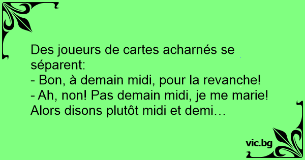 - Ah, non! Pas demain midi, je me marie! Alors disons plutôt midi et demi…