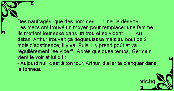 Les mecs ont trouvé un moyen pour remplacer une femme. Ils mettent leur sexe dans un trou et se vident...... Au début, Arthur trouvait ça dégueulasse mais au bout de 2 mois d'abstinence, il y va. Puis, il y prend goût et va régulièrement "se vider". Après quelques temps, Germain vient le voir et lui dit :