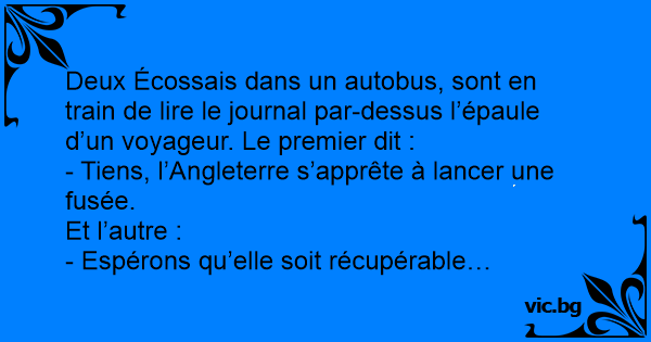 Deux Écossais dans un autobus, sont en train de lire le journal par-dessus l’épaule d’un voyageur. Le premier dit :
