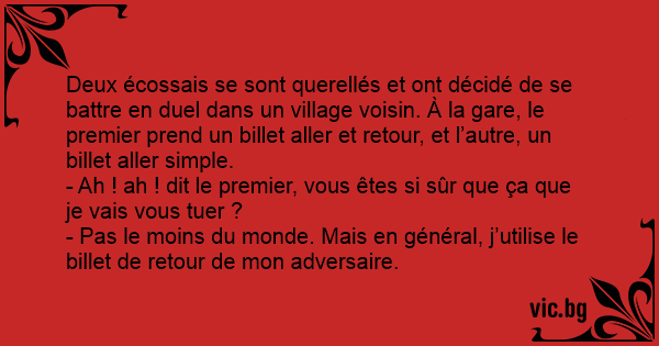 Deux écossais se sont querellés et ont décidé de se battre en duel dans un village voisin. À la gare, le premier prend un billet aller et retour, et l’autre, un billet aller simple.