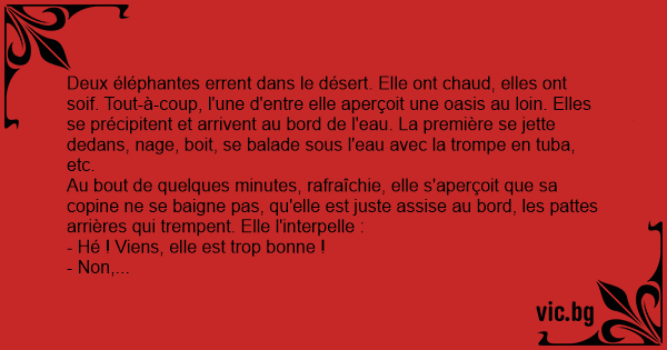 Deux éléphantes errent dans le désert. Elle ont chaud, elles ont soif. Tout-à-coup, l'une d'entre elle aperçoit une oasis au lоin. Elles se précipitent et arrivent au bord de l'eau. La première se jette dedans, nage, boit, se balade sous l'eau avec la trompe en tuba, etc.