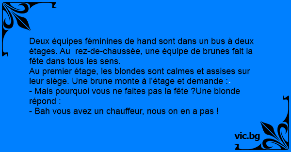 C’est deux belges qui visitent Londres et ils décident de prendre les fameux bus rouges à 2 étages. Ils se mettent en bas et, tout à coup, l’un dit à l’autre : - J’vais voir en haut comment c’est....