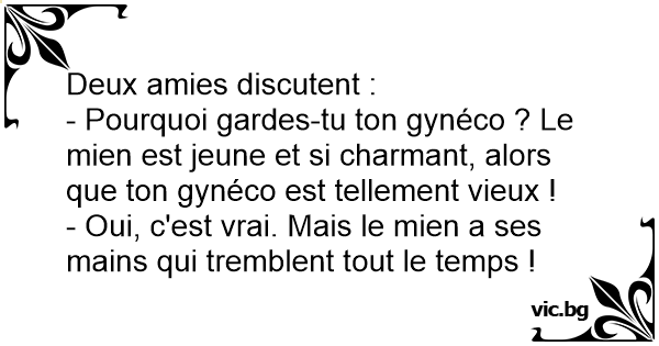 Une femme dit à son amie: "Je ne comprends pas pourquoi tu n'as pas encore changé de gynécologue. Regarde le mien, il est si jeune et si charmant! Alors que ton gynécologue est tellement vieux!"...