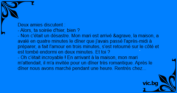 - Oh c'était incroyable ! En arrivant à la maison, mon mari m'attendait, il m'a invitée pour un dîner très romantique. Après le dîner nous avons marché pendant une heure. Rentrés chez nous, il a allumé toutes les bougies dans la maison et nos préliminaires ont duré une heure ! Après, nous avons fait l'amour pendant une heure ! Et après, on a discuté pendant une autre heure. C'était merveilleux !