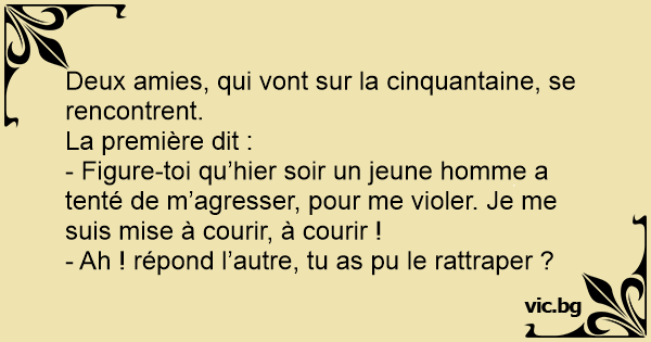 - Figure-toi qu’hier soir un jeune homme a tenté de m’agresser, pour me violer. Je me suis mise à courir, à courir !