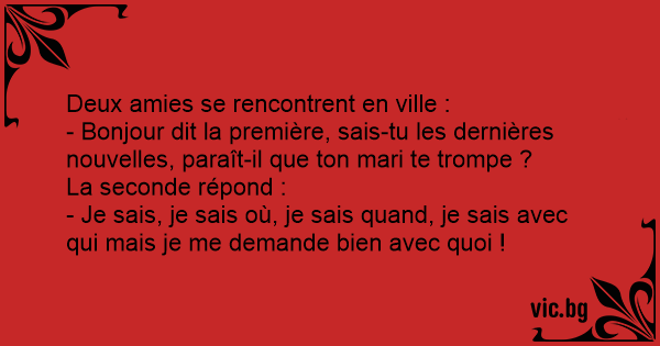 - Bonjour dit la première, sais-tu les dernières nouvelles, paraît-il que ton mari te trompe ?