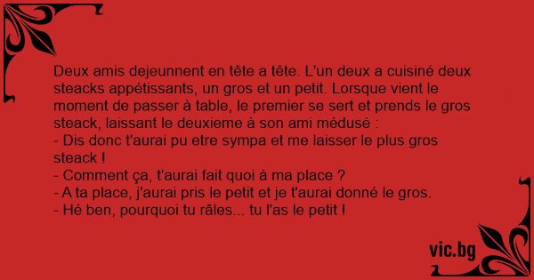 Deux amis dejeunnent en tête a tête. L'un deux a cuisiné deux steacks appétissants, un gros et un petit. Lorsque vient le moment de passer à table, le premier se sert et prends le gros steack, laissant le deuxieme à son ami médusé :