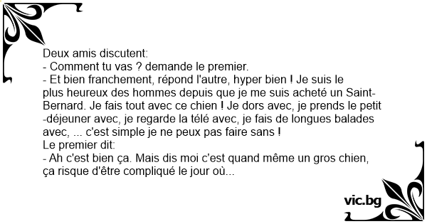 - Et bien franchement, répond l'autre, hyper bien ! Je suis le plus heureux des hommes depuis que je me suis acheté un Sаinт-Bernard. Je fais tout avec ce chien ! Je dors avec, je prends le petit-déjeuner avec, je regarde la télé avec, je fais de longues balades avec, ... c'est simple je ne peux pas faire sans !