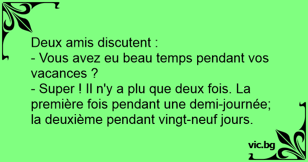 - Super ! Il n'y a plu que deux fois. La première fois pendant une demi-journée; la deuxième pendant vingt-neuf jours.