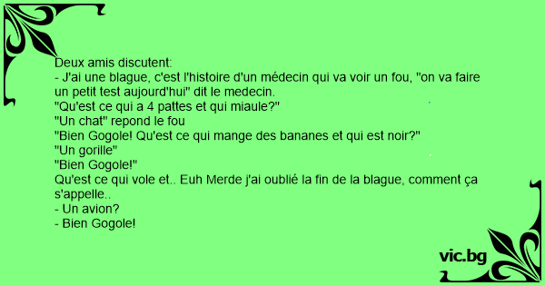 Deux amis discutent: - J'ai une blague, c'est l'histoire d'un médecin qui va voir un fou, "on va faire un petit test aujourd'hui" dit le medecin. "Qu'est ce qui a 4 pattes et qui miaule?" "Un chat" repond le fou "Bien Gogole! Qu'est ce qui mange des bananes et qui est noir?" "Un gorille" "Bien Gogole!" Qu'est ce qui vole et.. Euh Меrdе j'ai oublié la fin de la blague, comment ça s'appelle.. - Un avion? - Bien Gogole!