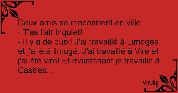 - Il y a de quoi! J'ai travaillé à Limoges et j'ai été limogé. J'ai travaillé à Vire et j'ai été viré! Et maintenant je travaille à Castres...