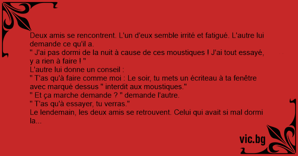 " T'as qu'à faire comme moi : Le soir, tu mets un écriteau à ta fenêtre avec marqué dessus " interdit aux moustiques."