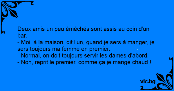 - Moi, à la maison, dit l'un, quand je sers à manger, je sers toujours ma femme en premier.