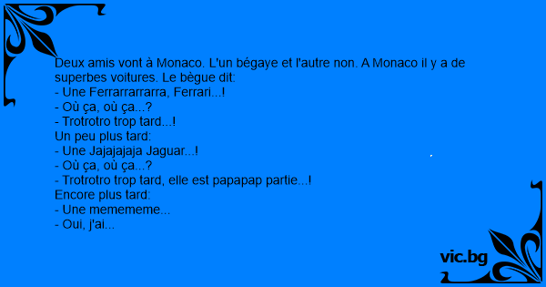 Deux amis vont à Monaco. L'un bégaye et l'autre non. A Monaco il y a de superbes voitures. Le bègue dit: