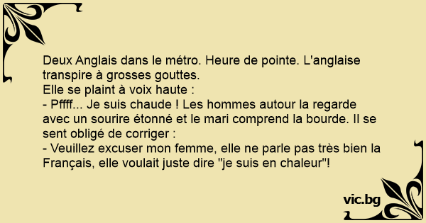 - Veuillez excuser mon femme, elle ne parle pas très bien la Français, elle voulait juste dire "je suis en chaleur"!