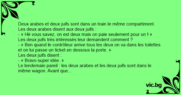 Le lendemain pareil : les deux arabes et les deux juifs sont dans le même wagon. Avant que le contrôleur n’arrive les deux juifs frappent à la porte des WC et l’un d’eux demande :