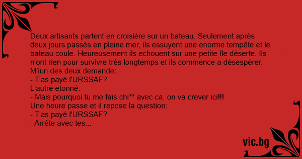Deux artisants partent en croisière sur un bateau. Seulement après deux jours passés en pleine mer, ils essuyent une enorme tempête et le bateau coule. Heureusement ils echouent sur une petite île déserte. Ils n'ont rien pour survivre très longtemps et ils commence a désespérer. M'iun des deux demande: