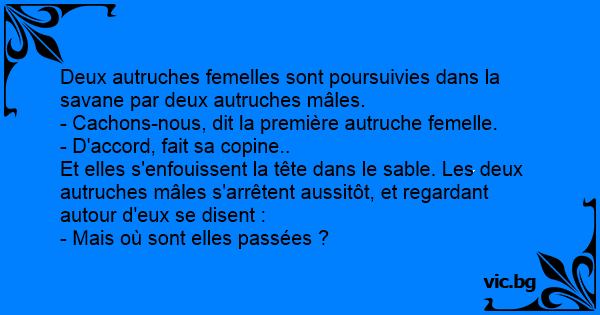 Et elles s'enfouissent la tête dans le sable. Les deux autruches mâles s'arrêtent aussitôt, et regardant autour d'eux se disent :