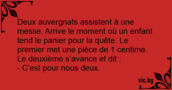 Deux auvergnats assistent à une messe. Arrive le moment où un enfant tend le panier pour la quête. Le premier met une pièce de 1 centime. Le deuxième s’avance et dit :