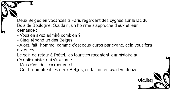 Deux Belges en vacances à Paris regardent des cygnes sur le lac du Bois de Boulogne. Soudain, un homme s'approche d'eux et leur demande : - Vous en avez admiré combien ? - Cinq, répond un des Belges. - Alors, fait l'homme, comme c'est deux euros par cygne, cela vous fera dix euros ! Le soir, de retour à l'hôtel, les touristes racontent leur histoire au réceptionniste, qui s'exclame : - Mais c'est de l'escroquerie ! - Oui ! Triomphent les deux Belges, en fait on en avait vu douze !