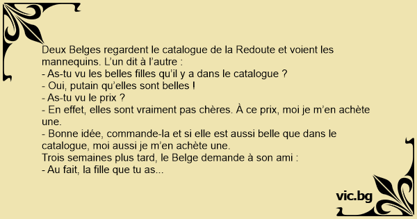 Deux Belges regardent le catalogue de la Redoute et voient les mannequins. L’un dit à l’autre :