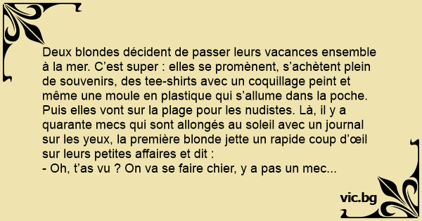 Puis elles vont sur la plage pour les nudistes. Là, il y a quarante mecs qui sont allongés au soleil avec un journal sur les yeux, la première blonde jette un rapide coup d’œil sur leurs petites affaires et dit :