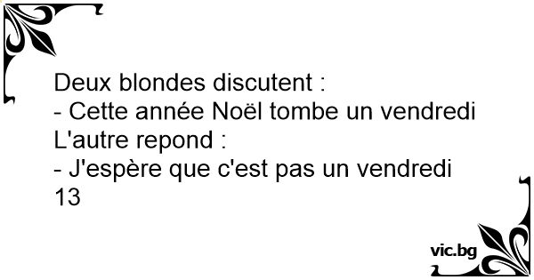Ene blondje: "Dit keer is oudjaar op een vrijdag." Andere blondje: "Nou, hopelijk niet op de 13de..."