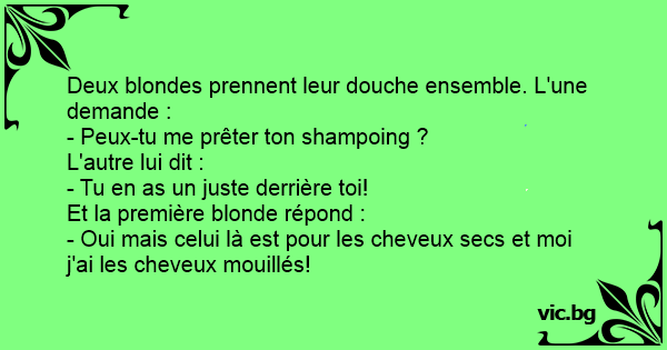Divas blondīnes dzīvo kopā. Viena no vannas istabas sauc: Atnes man lūdzu šampūnu! Otra: Kāpec? Vannas istaba taču ir pilna ar šampūniem. - Jā, bet te uz visiem rakstīts- sausiem matiem, bet es...