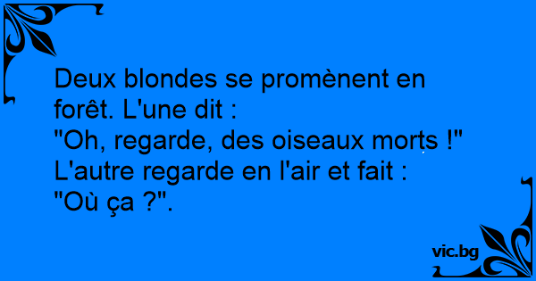 Deux blonde se promènent, soudainement ; l'une s'écrit : - Oh ! Regarde un oiseau mort ! - Où ça ?! Demande l'autre en regardant le ciel.
