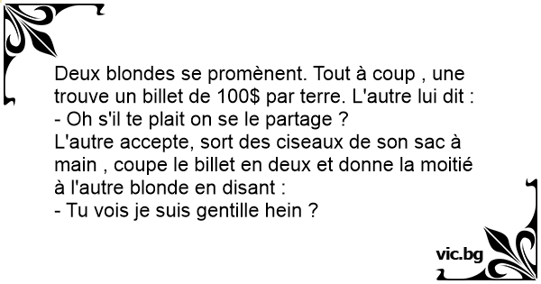 L'autre accepte, sort des ciseaux de son sac à main , coupe le billet en deux et donne la moitié à l'autre blonde en disant :