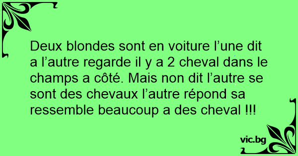 Deux blondes sont en voiture l’une dit a l’autre regarde il y a 2 cheval dans le champs a côté. Mais non dit l’autre se sont des chevaux l’autre répond sa ressemble beaucoup a des cheval !!!